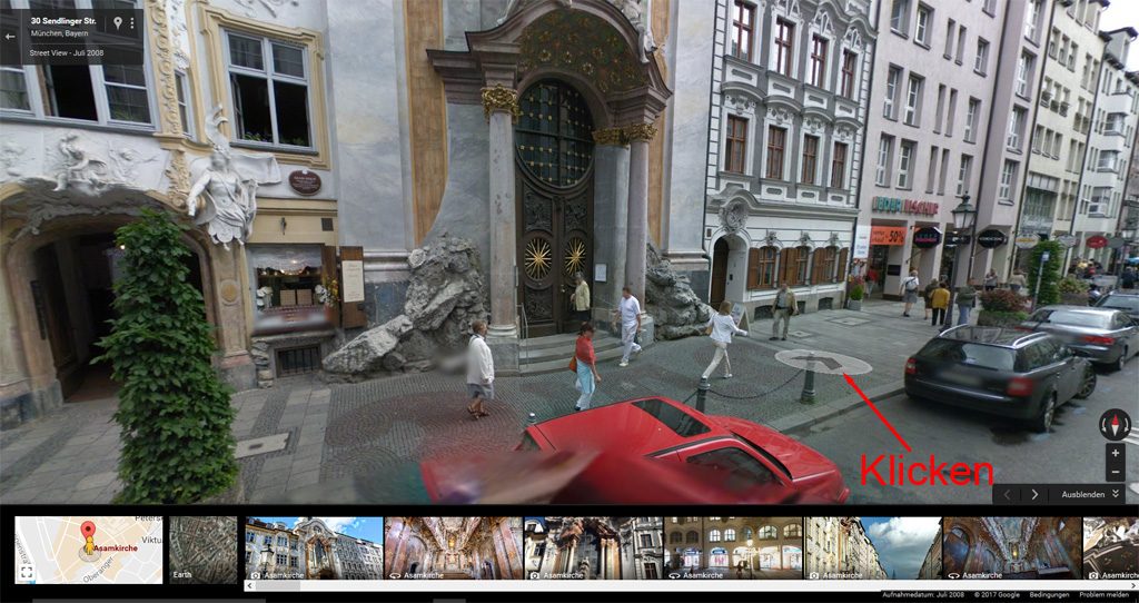 Nicht alles ist Street View. Es gibt auch Photo Sphere – Rundum Bilder, die von Google Nutzern erstellt werden. In Photo Sphere steht man an einem festen Punkt und kann einen 360° Blick wagen. Die echten Street View Bilder findet man auf den blauen Linien. Ich klicke nun auf die blaue Linie an der Asamkirche in München.